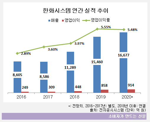 올해 실적은 더 좋아질 전망이다. 에프엔가이드 전망치에 따르면 한화시스템의 2020년 매출은 1조6677억 원, 영업이익은 914억 원이다.