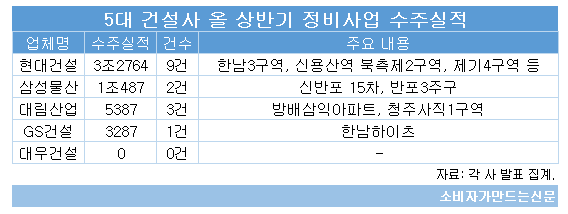 현대건설은 서울 강북권 최대 재개발 사업으로 일컬어지는 서울 용산구 한남동 한남3구역 재개발사업을 수주하는데 성공하면서 상반기에만 3조2000억 원대의 수주실적을 거뒀고, 삼성물산도 1조 원을 넘겼다. 반면 대림산업과 GS건설은 기대에 미치지 못했고, 대우건설은 올 상반기 정비사업 수주실적이 제로여서 하반기 반등을 노려야 하는 상황이 됐다.