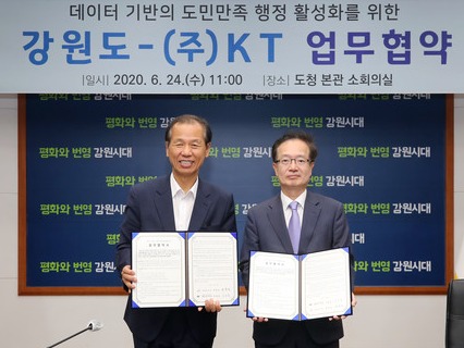 KT(대표이사 구현모)는 강원도(지사 최문순)와 오늘 춘천시 소재 강원도청에서 '빅데이터 기반의 도민 만족 행정 활성화를 위한 업무협약'(MOU)을 체결했다고 밝혔다. 강원도는 KT가 제공하는 빅데이터를 통해 일하는 방식을 개선하면서 맞춤형 민원 서비스를 제공할 방침이다.