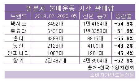 29일 한국수입차협회(KAIDA)에 따르면 불매 운동이 시작된 이후 일본차 판매량(지난해 7월~올해 5월 기준)은 토요타, 렉서스, 혼다, 닛산, 인피니티 다섯 브랜드를 합쳐 총 2만487대다. 전년 동기(4만3504대) 대비 반토막(-52.9%)났다.