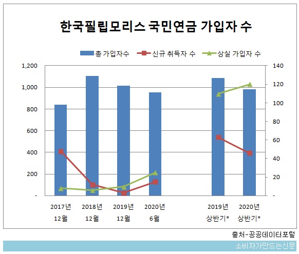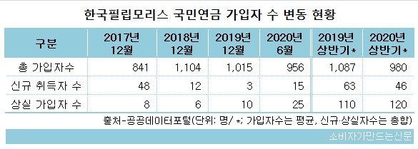 한국필립모리스의 국민연금 가입자 수는 2017년 800명 대에서 2018년 1000명에 진입했고 이후 1100명까지 증가했으나 지난해 하반기부터 감소하는 모습이다.