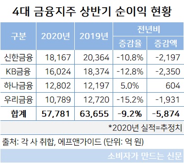 상반기 기준으로는 하나금융만 순이익이 5% 늘었고 나머지 3개사는 두 자릿수 감소율을 기록했다.