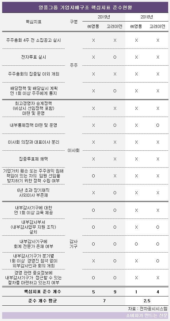 2018년에는 15개 지표 중 1건(내부감사기구에 회계 전문가 존재 여부)만 지켰다. 당시에도 (주)영풍은 준수 건수가 가장 적었다. 고려아연도 4건에서 9건으로 늘었다. 2018년 영풍그룹의 핵심지표 평균 준수 건수는 2.5건에 그쳤다.