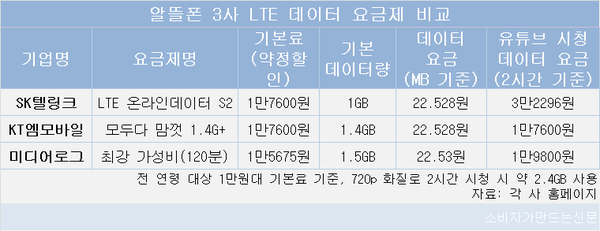 이들 요금제로 유튜브 앱을 통해 720p 화질의 동영상을 2시간 가량 시청한다고 가정하면 데이터 요금은 얼마나 나오게 될까. ▷SK텔링크는 3만2296원 ▷kt M모바일은 1만7600원 ▷미디어로그는 1만9800원이 각각 부과되는 것으로 나타났다.