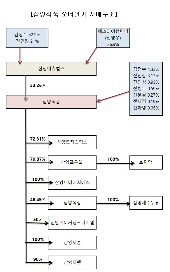 삼양식품 최대주주인 삼양내츄럴스는 2019년 말 기준 전인장 회장과 김정수 전 사장이 각각 지분 21%와 42.2%를 보유 중이다. 또 두 사람의 장남 전병우 해외사업본부 부장이 에스와이캠퍼스를 통해 26.9%를 보유, 여기에 삼양내츄럴스 자기지분(9.9%)을 포함하면 오너일가가 100% 지배하고 있는 구조다. 비글스에서 사명을 변경한 에스와이캠퍼스는 전병우 씨 개인회사다.