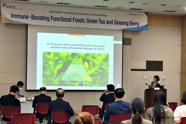 심포지엄서 아모레퍼시픽 기술연구원 바이탈뷰티연구소 박미영 박사는 녹차추출물의 호흡기 건강 개선 유효성 및 안정성 입증에 대해 발표했다.