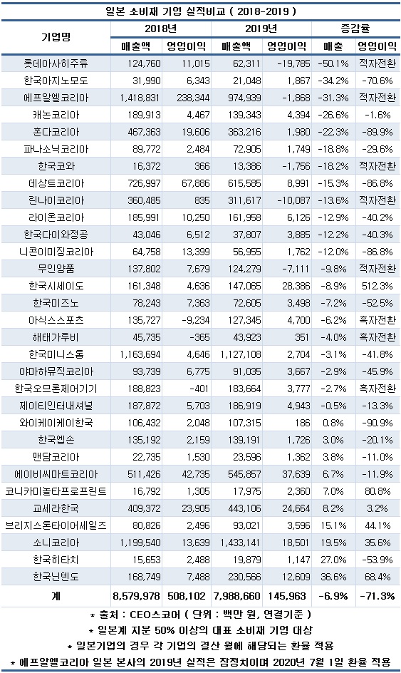 5일 기업평가사이트 CEO스코어(대표 박주근)가 일본의 대한민국 수출규제 전·후 한국에 진출한 일본 소비재 기업 31곳의 경영성적을 비교한 결과 이들 기업이 지난해 한국에서 올린 매출액은 전년 대비 6.9% 줄었고 영업이익은 71.3% 급감한 것으로 집계됐다.