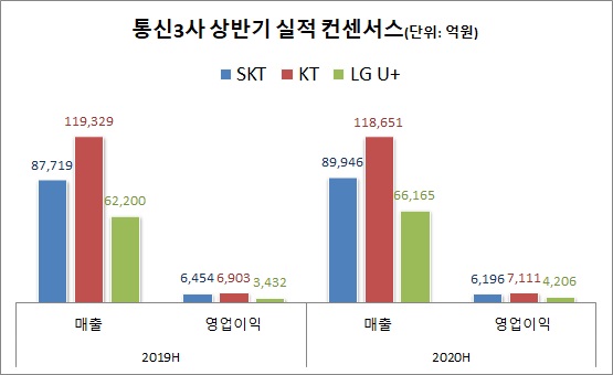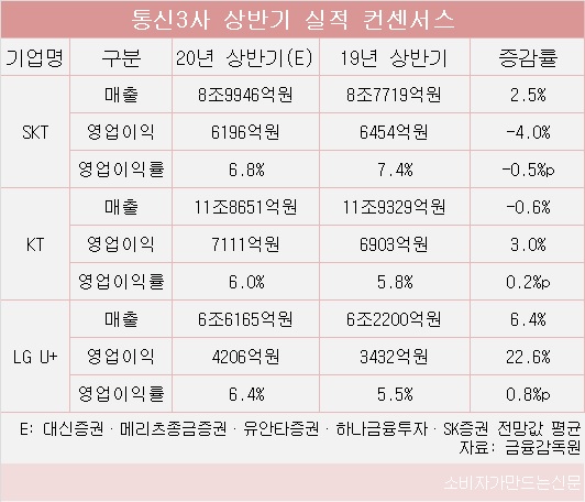 최근 한달간 증권사들이 내놓은 추정 실적치의 평균값을 구한 결과 코로나19 여파에도 통신3사의 올해 상반기 매출은 9조1587억 원으로 지난해 상반기보다 2% 증가하고, 영업이익은 5838억 원으로 4.1% 늘어난 것으로 나타났다.