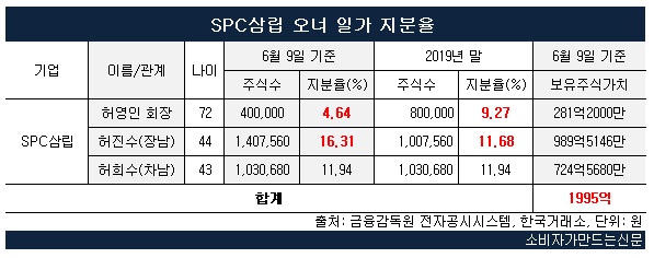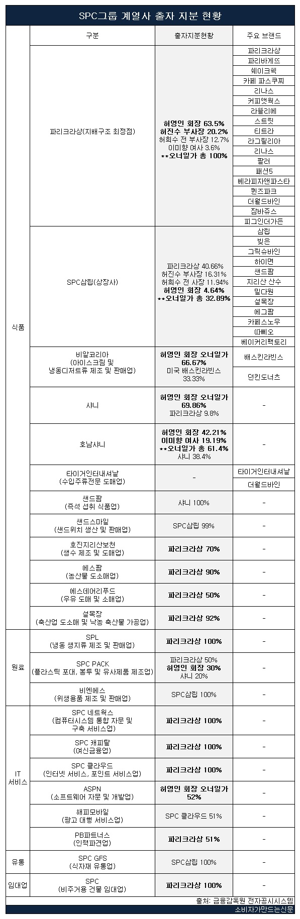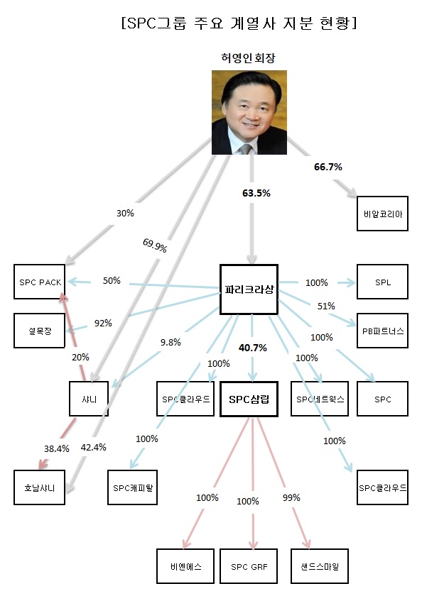 SPC그룹의 지주사 격인 파리크라상은 허영인 회장이 63.5% 지분을 보유하며 최대주주로 자리하고 있다. 허 회장의 두 아들인 허진수 부사장과 허희수 전 부사장은 각각 20.2%, 12.7%, 허 회장 배우자인 이미향 여사가 3.6%로 오너일가가 100% 지분을 나눠서 보유하고 있다.
