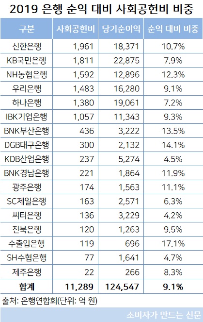 은행별로는 신한은행(행장 진옥동)의 사회공헌활동비가 1961억 원으로 가장 많았다. 그 뒤로 KB국민은행, NH농협은행, 우리은행, 하나은행, IBK기업은행 순으로 나타났다.