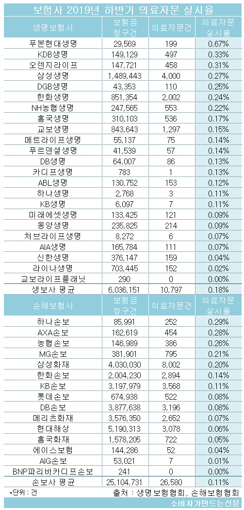 보험금 청구 건수 대비 의료자문 실시건은 생보사가 평균 0.18%, 손보사가 0.11%였다.