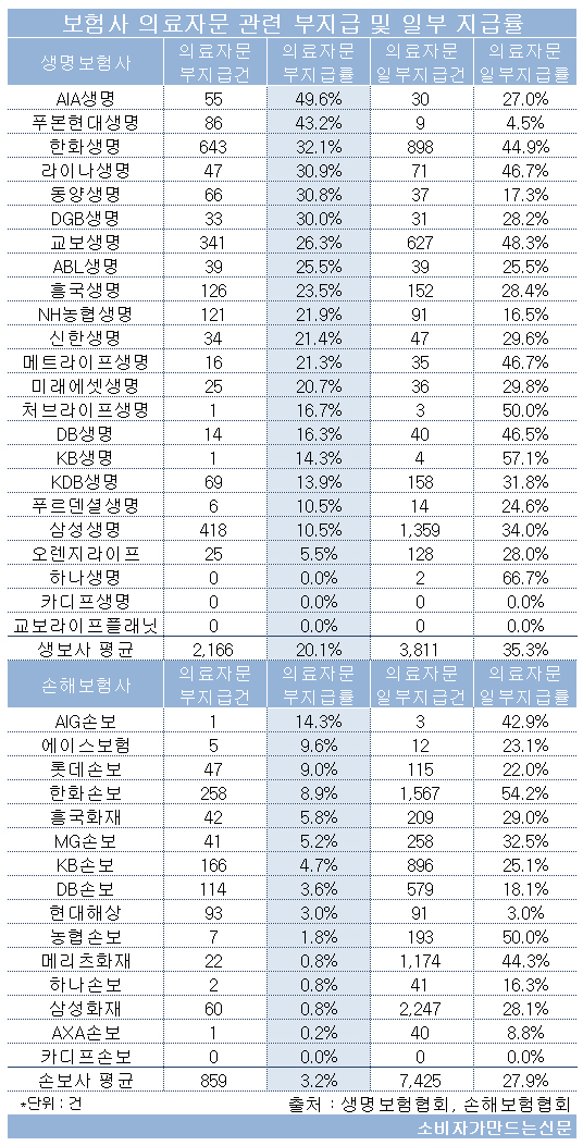 한화생명 관계자는 "의료자문 실시율이 0.2%에 불과해 99.8%를 지급하고 정말 의심되는 청구건을 조사하다 보니 부지급건이 많아졌다"며 "보험금을 부지급하거나 삭감하기 위해 의료자문을 실시한다는 것은 오해"라고 설명했다.
