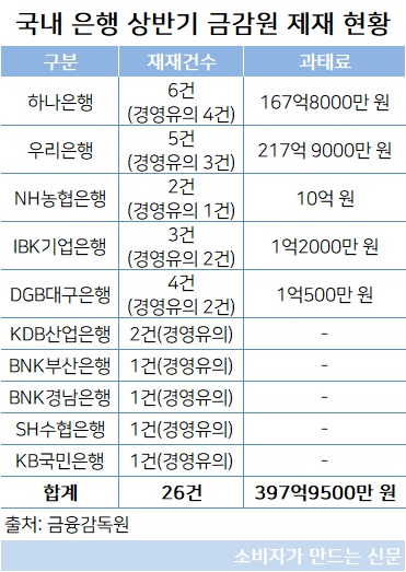 은행별 제재 건수는 하나은행이 6건으로 가장 많았고 그 뒤로 우리은행 5건, 대구은행 4건, IBK기업은행 3건 순이었다. 이밖에 NH농협은행과 KDB산업은행이 각각 2건, BNK부산은행·BNK경남은행·SH수협·KB국민은행이 각 1건씩이다.