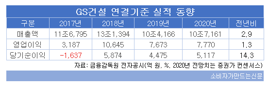 증권가 컨센서스에 따르면 올해 GS건설의 매출은 10조7161억 원으로 전년보다 2.9% 증가하고, 영업이익은 7770억 원으로 1.3% 늘어날 전망이다.
