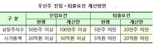 가장 눈에 띄는 점은 우선주 진입 및 퇴출기준을 강화 조치다. 현행 우선주 상장 조건은 상장 주식수가 50만 주 이상이지만 이를 2배 늘려 100만 주로 상향 조정했다. 또한 퇴출 요건도 현행 5만 주에서 20만 주로 늘렸다.