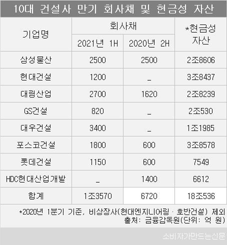 한 건설사 관계자는 "보유 현금량이 많은 회사는 회사채가 문제가 될 것 같진 않다"며 "금리 등을 고려해 현금 상환, 차환 발행 등 납부 방식을 결정해야 할 것"이라고 말했다.