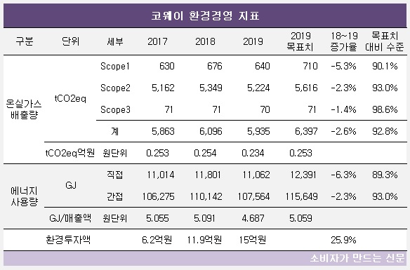 코웨이의 지난해 온실가스배출량은 5935tCO2eq(온실가스를 이산화탄소 배출량으로 환산한 단위)로 전년에 비해 2.6% 감소했다. 당초 2019년 목표치로 삼았던 6397tCO2eq에 비해 실제 배출한 온실가스는 92.8% 수준에 그친다.