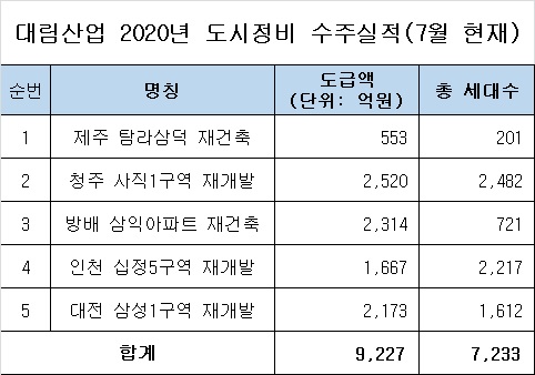 대림산업(대표 배원복)에 따르면 지난 11일 회사는 '인천 십정 5구역 재개발 사업'과 '대전 삼성 1구역 재개발 사업' 시공사로 각각 선정됐다. 이에 따라 대림은 올 1월부터 현재까지 서울 · 지방 등 5곳의 도시정비사업을 총 9227억 원 규모로 수주하게 됐다.