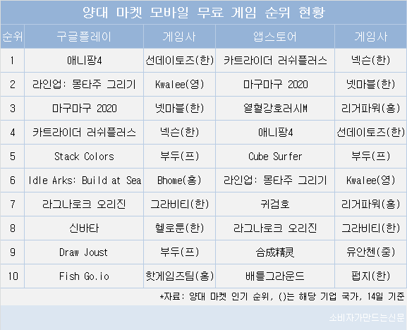지난 14일 기준으로 구글 플레이 스토어 상위 10위 인기 모바일 게임 중 한국 게임은 5개인 것으로 나타났다. 애플 앱스토어에서도 마찬가지로 5개의 한국 게임이 10위권에 진입했다.