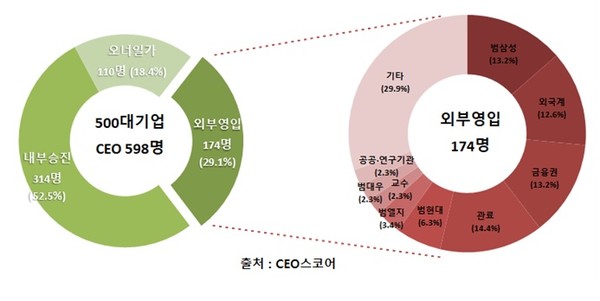 15일 기업평가사이트 CEO스코어(대표 박주근)가 지난 6월 말 기준 국내 500대 기업 현직 대표이사 663명 중 이력을 공개한 598명을 조사한 결과 외부에서 영입된 인물은 174명으로 전체의 29.1%를 차지했다. 내부 승진은 314명(52.5%), 오너일가는 110명(18.4%)이었다.