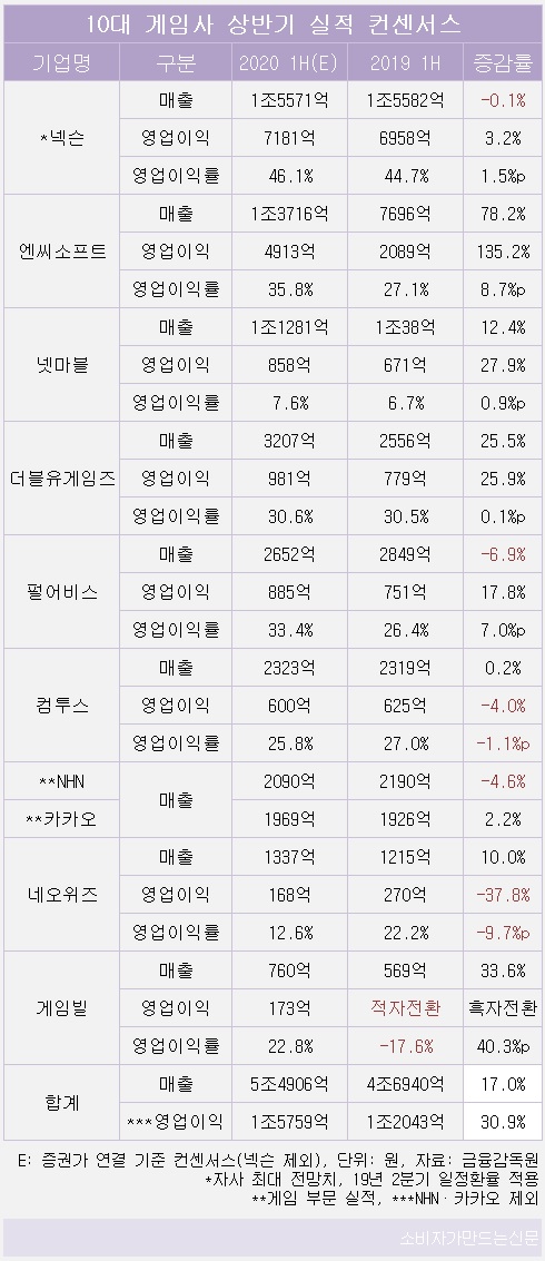 국내 10대 게임사의 상반기 매출은 지난해 상반기보다 17% 증가하고, 영업이익은 평균 30%가량 늘어날 것으로 추정된다.