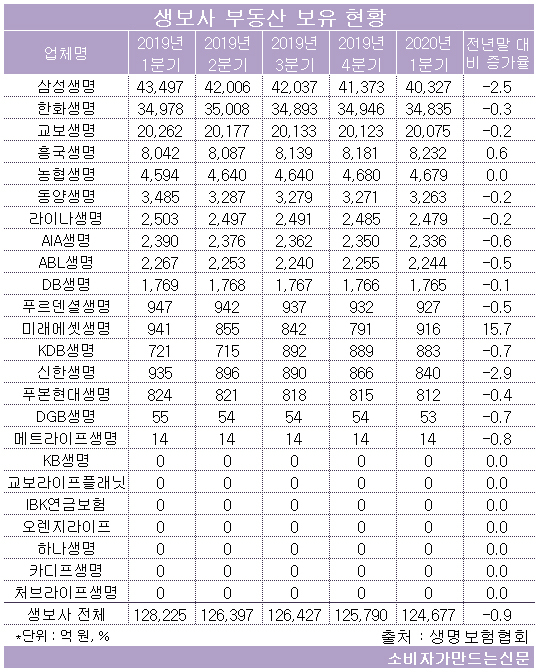 24개 생명보험사 가운데 부동산 보유액이 가장 많은 곳은 삼성생명이었다. 삼성생명의 올해 1분기 부동산 보유액은 4조327억 원으로 지난해 말보다 2.5% 감소했다.