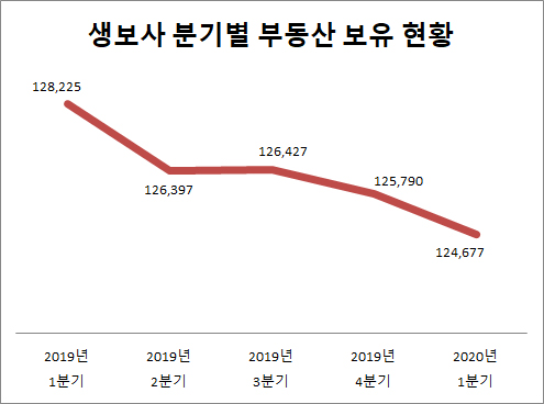 생보사 부동산 보유액은 매분기 줄어드는 추세에 있다. 지난해 1분기 12조8225억 원이었지만 2분기 12조6397억 원으로 1.4% 줄었으며 3분기 KDB생명 덕에 소폭 올랐다가 지난해 말 12조5790억 원으로 내려앉았다.