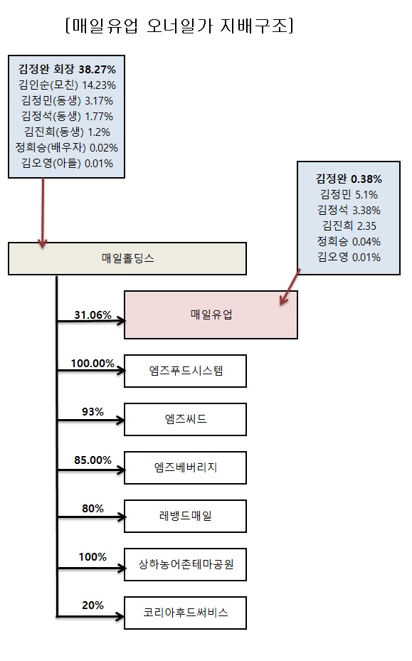 김정완 회장은 일찌감치 후계자로 낙점됐지만 2016년 말까지도 매일유업 지분율은 15.93%에 그쳤다. 지주사 체제 전환 과정에서 김정완 회장은 보유 중인 매일유업 주식을 매일홀딩스에 넘기는 대신 매일홀딩스 신주를 취득했다. 이 과정에서 김 회장은 지주사 매일홀딩스 지분율을 38.27%까지 끌어올리며 오너쉽을 강화했다.