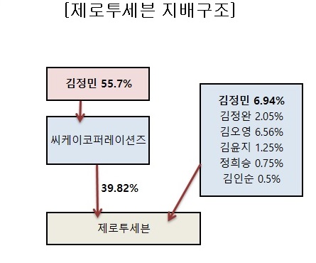 제로투세븐이 씨케이팩키지를 흡수합병하면서, 씨케이팩키지 모회사인 씨케이코퍼레이션즈가 제로투세븐의 최대주주(39.82%)가 됐다. 씨케이코퍼레이션즈 최대주주는 김정민 회장이다. 김 회장은 개인 보유 지분 및 씨케이코퍼레이션즈(46.67%)를 통해 실질적으로 지배구조 최정점에 섰다.