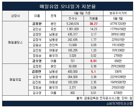 국내 3대 유제품업체인 매일유업(대표 김선희)은 지주사 매일홀딩스(대표 김정완)를 지배회사로 두고 있다. 매일홀딩스와 매일유업 등 상장사 2곳의 시가총액은 약 7170억 원이며 이 가운데 오너일가가 보유한 주식가치는 6월 9일 종가기준 약 1485억 원이다.