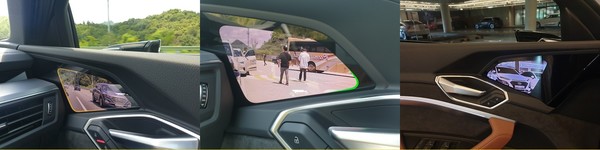 가장 눈에 띄는 차이점은 단연 사이드 미러다. e-트론은 기존 사이드미러 자리에 카메라를 설치했고 사이드미러 역할을 해줄 모니터를 차 안으로 집어넣었다. 아우디에 따르면 공기역학적 성능을 높이고 미래지향적 디자인을 강조하기 위함이라고 한다. 모니터는 터치도 가능해 운전자 기호대로 각도나 크기를 설정할 수 있다.