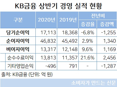 KB금융 관계자는 “상반기 순수수료이익은 주식거래대금 관련 수탁수수료와 IB수수료 중심으로 증권업수입수수료가 큰 폭으로 증가하고 카드 이용금액 증가와 비용 절감 노력의 결실로 신용카드수수료손익이 확대되는 등 비은행 부문의 실적이 증대된데 힘입어 전년동기 대비 21.6% 증가했다”고 밝혔다.