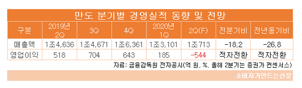 증권가 컨센서스에 따르면 만도는 올해 2분기 544억 원의 영업손실을 낼 것으로 전망된다. 지난해 2분기 518억 원의 흑자에서 적자로 전환되는 것이다. 매출은 1조713억 원으로 지난해 같은 기간보다 26.8% 감소할 전망이다.