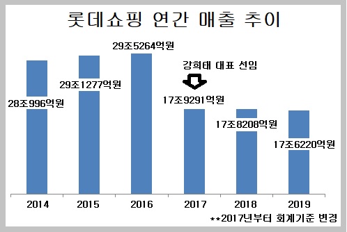 강 부회장이 대표로 선임되기 전까지만 해도 롯데쇼핑은 매출이 꾸준한 성장세에 있었다. 2017년부터 회계기준이 바뀌어 직접적인 매출 비교는 어렵지만, 롯데쇼핑은 2011년 매출 20조 원을 넘어섰고 2016년 29조5264억 원으로 늘었다. 이 기간 연간 매출이 전년에 비해 감소한 것은 2014년 한 번뿐이다. 그마저도 매출 감소율은 0.4%에 그친다.