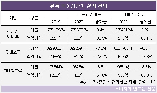 하지만 신세계(대표 차정호)와 이마트(대표 강희석)의 상반기 매출 합계는 12조6000억 원으로 전년에 비해 3.4% 증가할 것으로 예상돼 롯데쇼핑과 대조된다. 현대백화점(대표 김형종)도 9800억 원으로 감소폭(6.8%)이 롯데쇼핑보다는 낮을 전망이다.