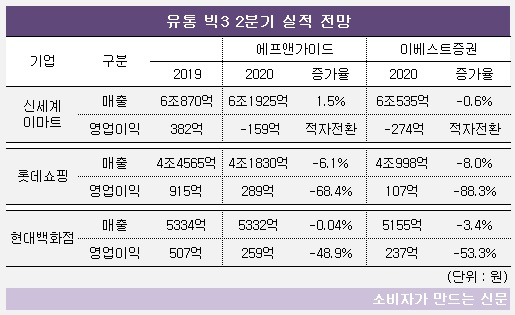 에프앤가이드는 신세계와 이마트의 2분기 매출이 전년에 비해 1.7% 늘어날 것이라 전망했다. 이베스트증권은 0.6% 감소를 예상했는데, 롯데쇼핑보다는 매출 감소율이 크게 낮다.