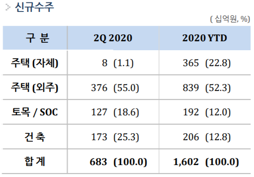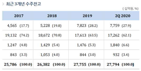 2분기 신규 수주액은 6830억 원을 기록하며 상반기 누계 수주액 1조6020억 원을 달성했다. 수주 잔고는 △2017년 25조7860억 원에서 △2018년 26조3820억 원 △2019년 27조7550억 원 △올 2분기 기준 27조7940억 원이다.