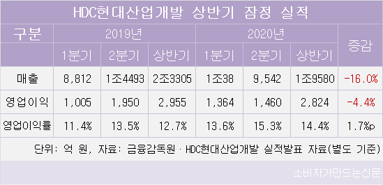 HDC현대산업개발은 별도 재무제표 기준으로 올 2분기 매출 9542억 원 · 영업이익 1460억 원을 기록했다고 22일 잠정 공시했다.