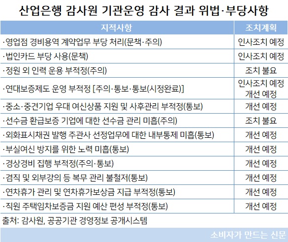 지난 21일 감사원이 발표한 기관운영감사보고서에 따르면 산업은행은 영업점 경비용역 계약업무 부당 처리와 법인카드 부당 사용 등 12개 항목에 대한 감사지적을 받은 것으로 나타났다.