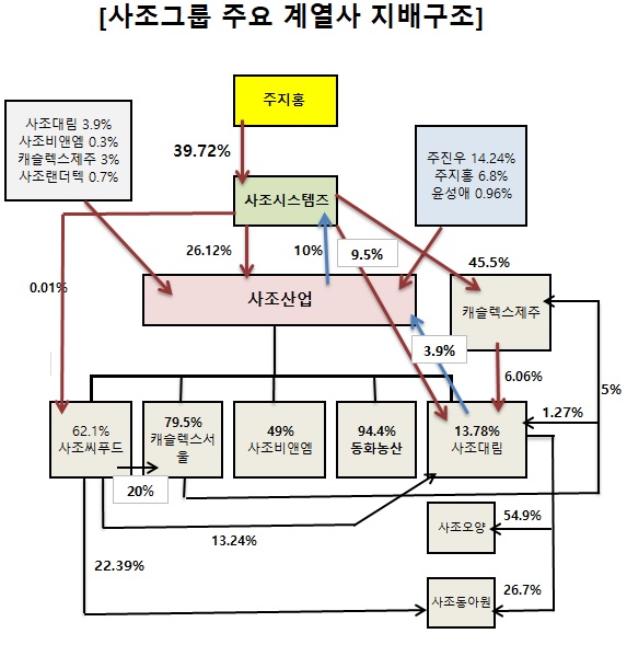 사조대림은 사조동아원 최대주주지만 지분율이 26.7%에 그치고, 사조산업 밑의 사조씨푸드가 갖고 있는 사조동아원 지분 22.39%를 합쳐야 지분율이 49.09%로 역시 절반을 밑돈다.