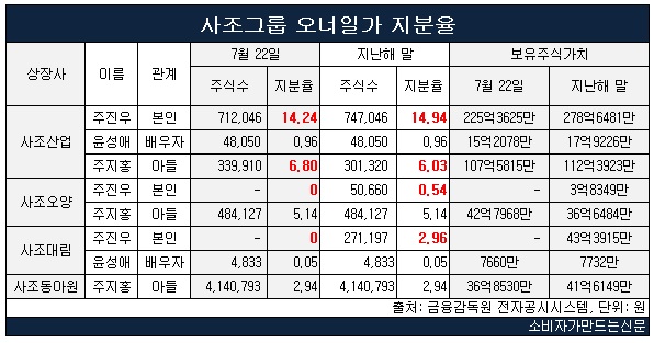 사조그룹은 사조산업(대표 이창주)이 사실상 지주사 역할을 하고 있으나 계열사간 출자구조가 복잡하게 얽혀 있다. 사조산업을 비롯해 사조대림과 사조오양, 사조씨푸드, 사조동아원 등 5개 상장사의 시가총액은 약 5661억 원이며 이 가운데 오너일가가 보유한 주식가치는 7월 22일 종가 기준 428억5678만 원이다.