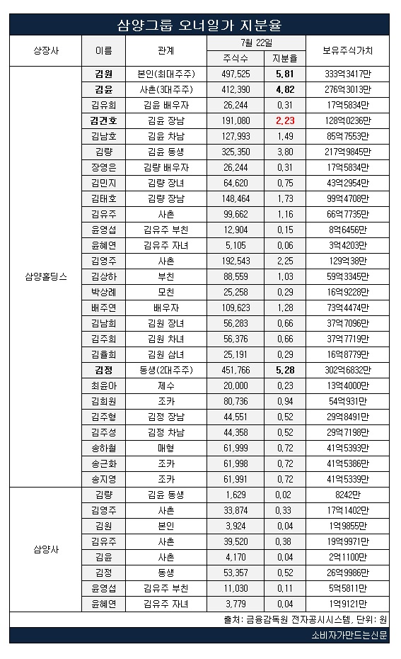 삼양그룹 지배구조 최정점에 자리한 삼양홀딩스의 지분구조를 살펴보면 김상홍 명예회장의 아들이 아닌, 김상하 회장의 아들 김원 삼양사 부회장이 5.81% 지분을 보유한 최대주주다. 김원 부회장의 보유주식가치는 7월 22일 종가기준 약 333억3417만 원이다. 김원 부회장의 동생인 김정 삼양패키징 부회장이 5.28%로 2대주주, 사촌인 김윤 삼양홀딩스 회장이 4.82%로 3대주주로 이름을 올렸다. 이들의 보유주식가치는 각각 302억6832만 원, 276억3013만 원으로 나타났다.