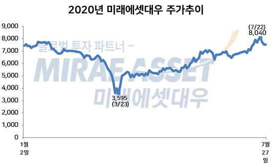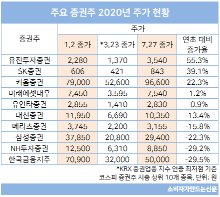 증권주 시총 1위 미래에셋대우도 지난 3월 하락한 이후 완만하게 상승한 끝에 연초 주가 수준을 회복했다. 지난 27일 종가 기준 미래에셋대우 주가는 7500원으로 연초(7450원) 대비 상승했고 연중 최저점(3595원) 대비로는 2배 이상 올랐다.