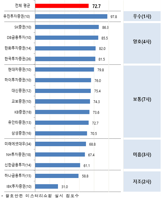 SK증권(86.3점)과 DB금융투자(85.5점), 한화투자증권(82점), 한국투자증권(81.5점) 등도 80점 이상 점수를 받아 '양호' 판정을 받았다.