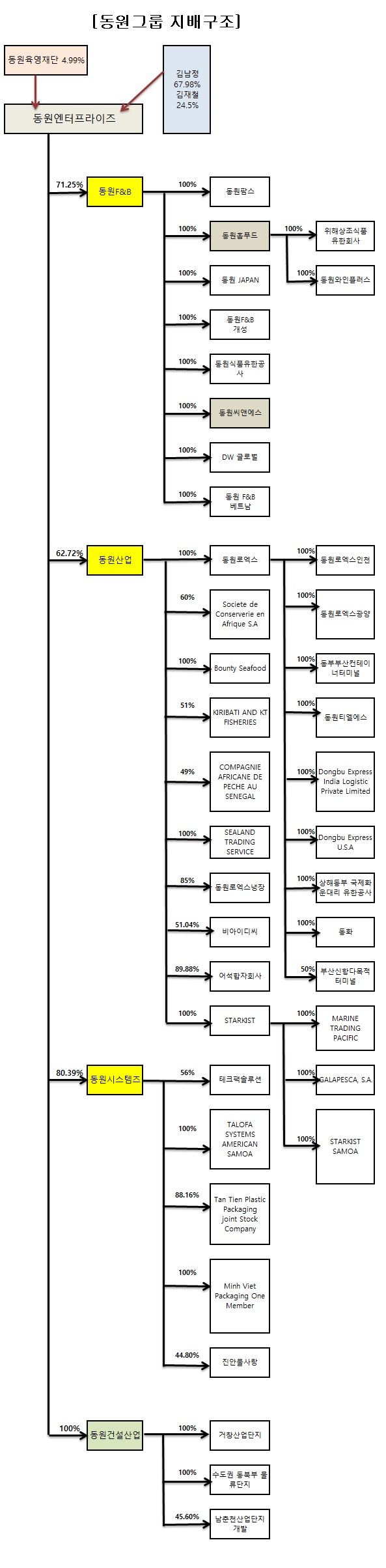 즉, ‘김남정 부회장→동원엔터프라이즈→자회자‧손자회사‧증손회사’ 구조로 이어진다.