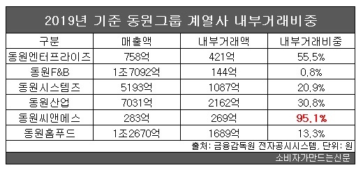 이외 동원엔터프라이즈의 자회사인 동원F&B와 동원산업, 동원시스템즈를 비롯 손자회사인 동원씨앤에스, 동원홈푸드 등 또한 내부거래 비중은 최대 95% 이상에 달하는 것으로 나타났다.