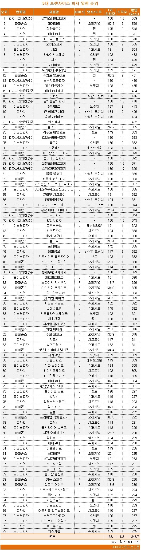 칼로리를 기준으로 30위 안에 가장 많은 제품이 포함된 피자 브랜드는 미스터피자(10개)였다. 이어 피자나라치킨공주(9개), 피자헛(6개), 파파존스(4개), 도미노피자(1개) 순이었다.