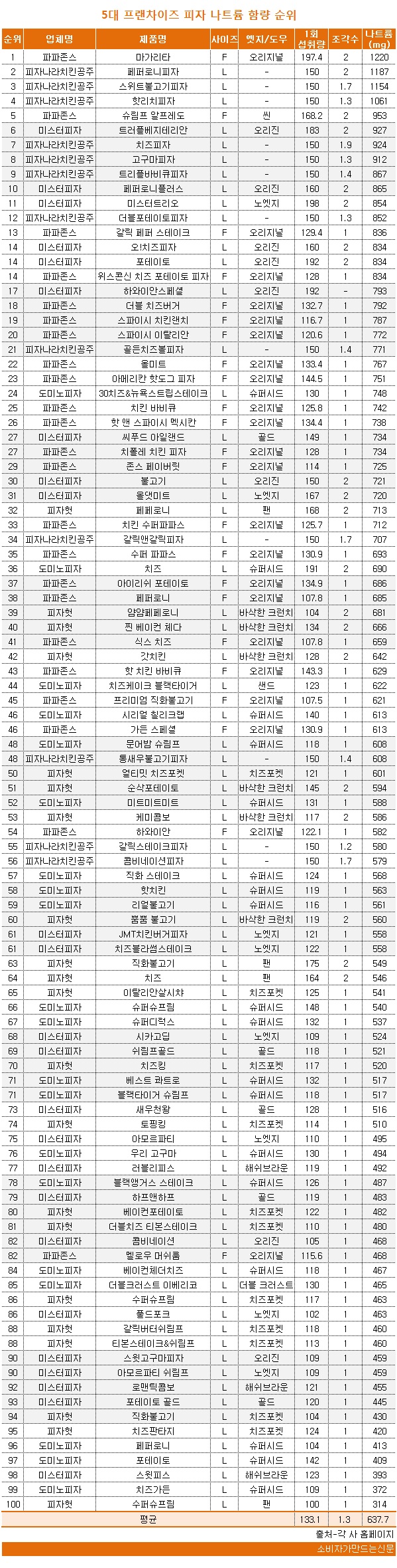 나트륨이 가장 높은 제품 상위권에는 파파존스 피자와 피자나라치킨공주 제품이 포진했다.