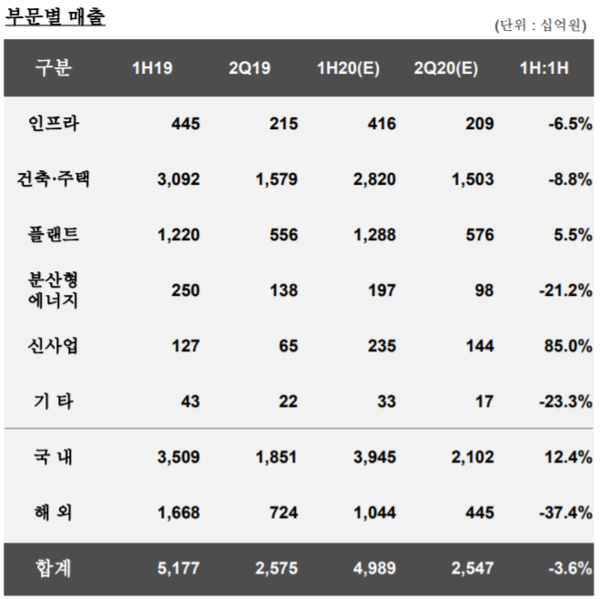 상반기 매출은 코로나19 등 불확실한 대외 환경으로 지난해 상반기보다 3.6% 소폭 감소했다. 영업이익 · 순이익도 15.4% · 21.2% 감소했는데 신규 수주는 지난해 상반기 대비 17.9% 증가한 4조6858억 원을 기록했다.