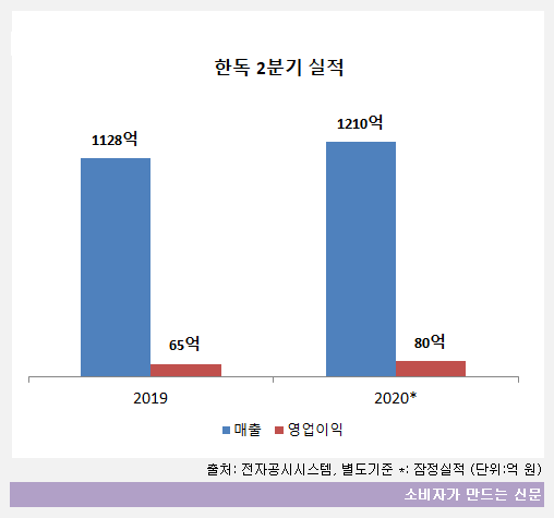 한독에 따르면 별도기준 2분기 잠정 매출액은 1210억 원, 영업이익은 80억 원으로 집계됐다. 전년 동기에 비해 매출은 7.3%, 영업이익은 23.2% 증가한 수치다.